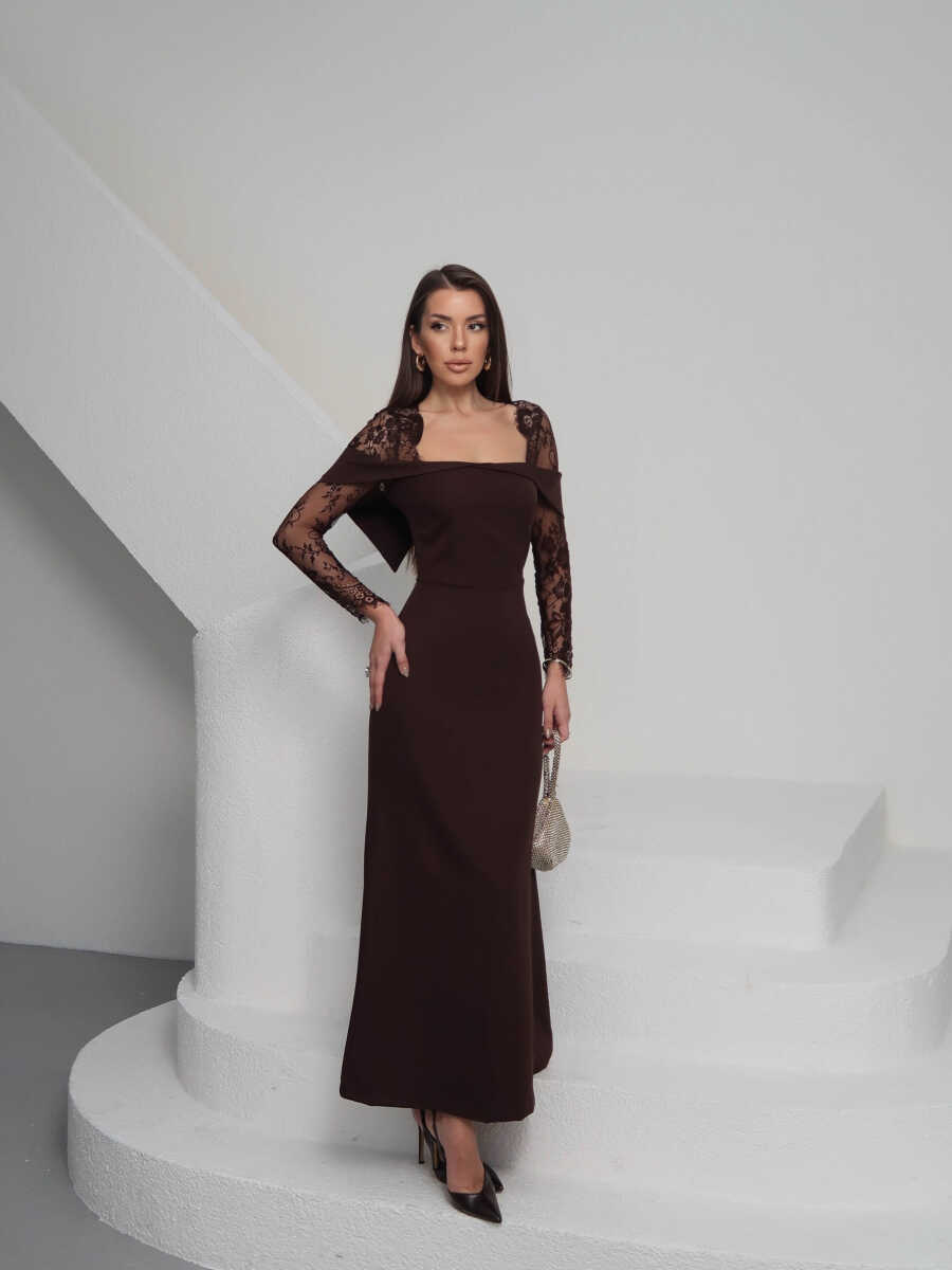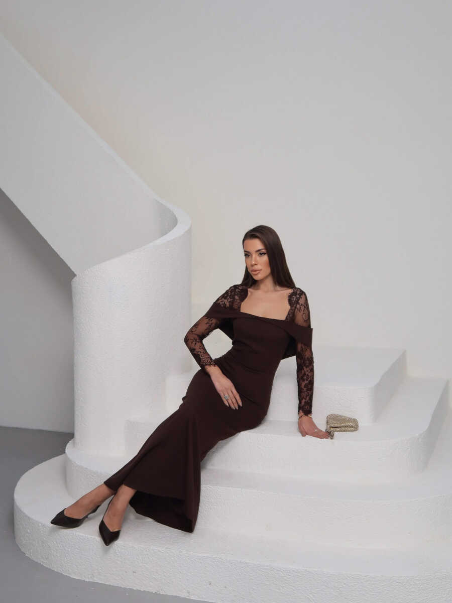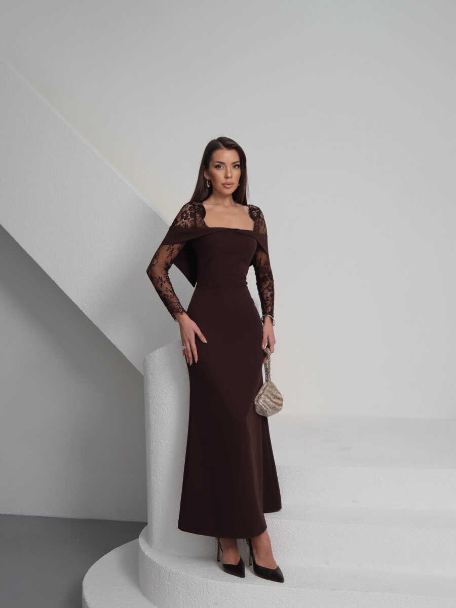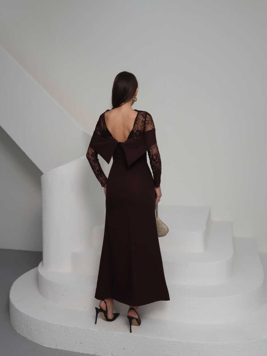 Sandrine Tül Kol Maxi Elbise - Acı Kahve